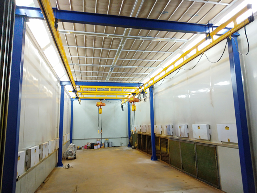 承重梁两边的小轿车一部分在与承重梁方位竖直的两根平行面吊式KBK路轨中运作,双梁与pk型环链电动葫芦配套设施应用,环链葫芦运作小轿车顺着承重梁方位运作。